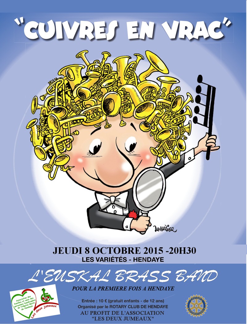 CONCERT avec EUSKAL BRASS BAND au profit de l’ASSOCIATION Publié le 03/10/2015 par association Les Deux Jumeaux PETIT RAPPEL POUR LES AMIS AQUITAINS CONCERT ORGANISE PAR LE ROTARY CLUB DE HENDAYE en faveur des patients de l’HÔPITAL MARIN DE HENDAYE: JEUDI 8 OCTOBRE à 20H30mn. Partagez! Cliquez pour partager sur Facebook(ouvre dans une nouvelle fenêtre) Facebook