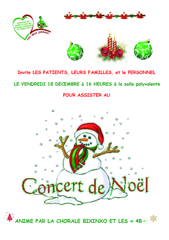 FÊTE DE NOËL à L’HÔPITAL : CONCERT et GOÛTER Publié le 14/12/2015 par association Les Deux Jumeaux APRES AVOIR ECOUTE LES JOLIS CHANTS DE NOËL – GOÛTER POUR TOUS: café, chocolat et pâtisseries régaleront les papilles des acteurs et spectateurs. Partagez! Cliquez pour partager sur Facebook(ouvre dans une nouvelle fenêtre) Facebook