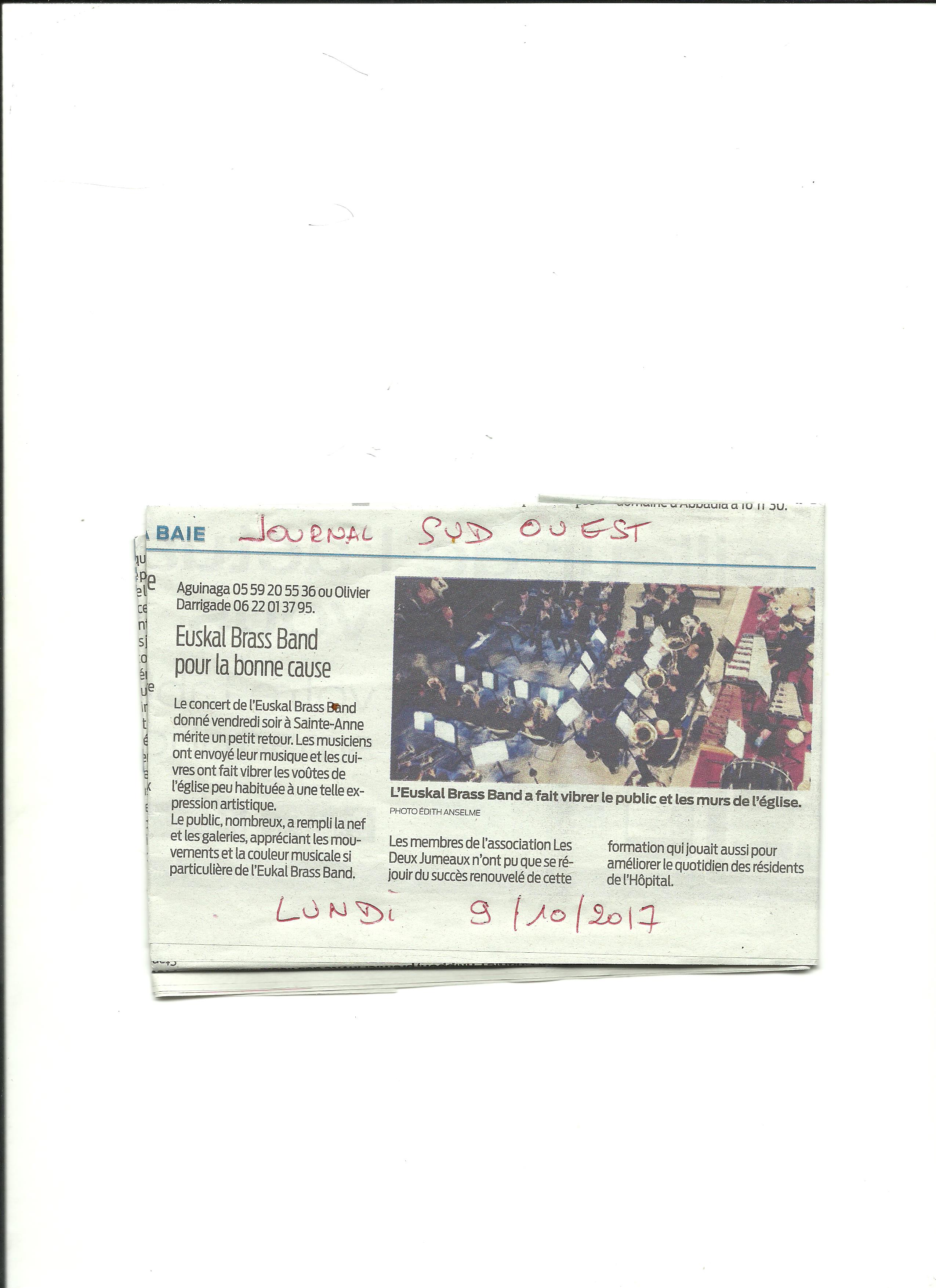 CONCERT EUSKAL BRASS BAND- MERCI! Publié le 09/10/201709/10/2017 par Deux Jumeaux 96 MERCI à toutes les personnes présentes VENDREDI SOIR, aux musiciens qui ont enchanté l’assemblée et à tous les bénévoles, sans oublier les membres du CLUB ROTARY D’HENDAYE Partagez! Cliquez pour partager sur Facebook(ouvre dans une nouvelle fenêtre) Facebook
