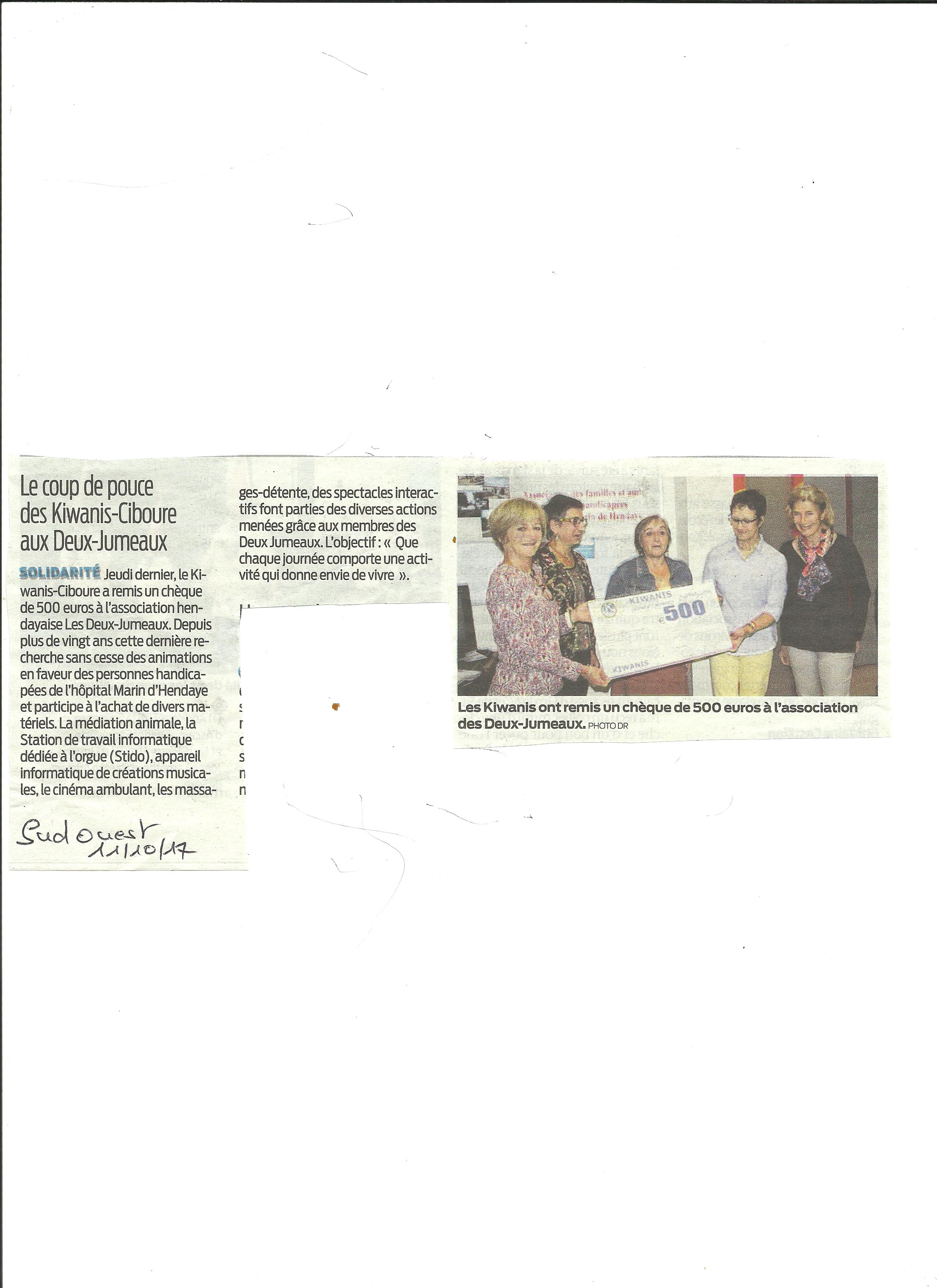 MERCI AU CLUB KIWANIS CIBOURE Publié le 11/10/2017 par Deux Jumeaux 96 Le 5 octobre à l’Hôpital Marin trois membres du CLUB KIWANIS nous ont remis un CHEQUE de 500€. Superbe CADEAU qui signe 5 années d’amitié, de confiance, de partenariat . MERCI! Partagez! Partager sur Facebook(ouvre dans une nouvelle fenêtre) Facebook