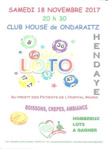 LOTO 18 NOVEMBRE 2017 à 20H30MN CLUB HOUSE ONDARAITZ Publié le 03/11/201705/11/2017 par Deux Jumeaux 96 VENEZ NOMBREUX GAGNER UN DES NOMBREUX LOTS DE VALEUR MIS EN JEU à CETTE SOIREE! Partagez! Cliquez pour partager sur Facebook(ouvre dans une nouvelle fenêtre) Facebook