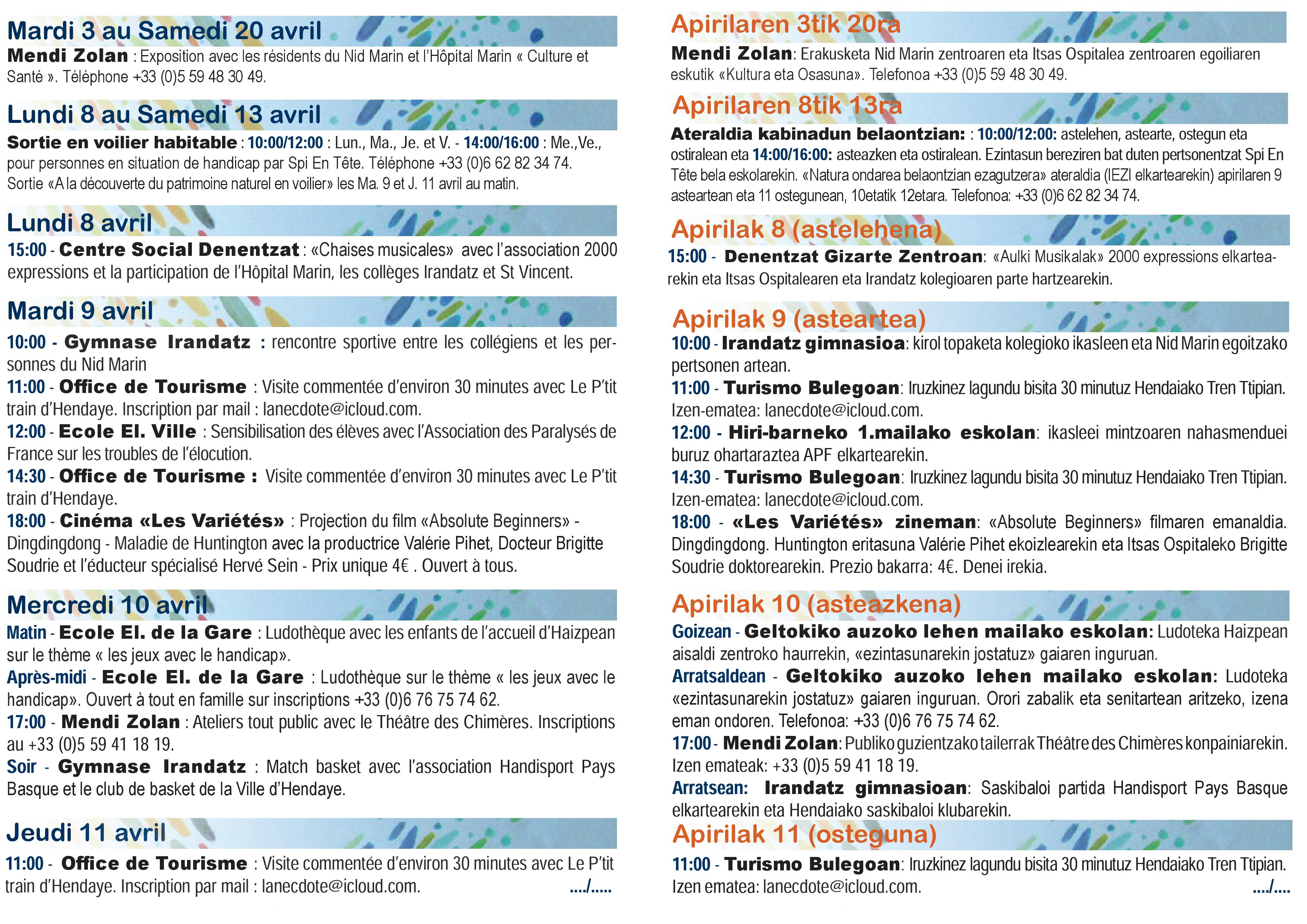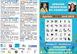 SEMAINE HENDAYAISE DU HANDICAP Publié le 07/04/201907/04/2019 par Deux Jumeaux 96 N’HESITEZ PAS à CONSULTER LE PROGRAMME ET à VENIR NOMBREUX ENCOURAGER LES PATIENTS! Partagez! Partager sur Facebook(ouvre dans une nouvelle fenêtre) Facebook