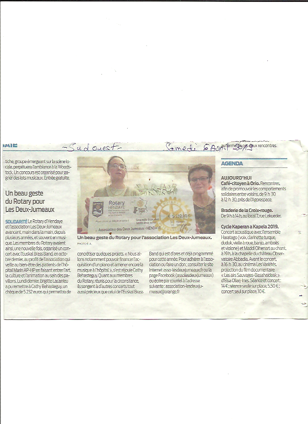 MERCI AU CLUB ROTARY et à la FONDATION pour ce beau CADEAU Publié le 09/04/2019 par Deux Jumeaux 96 ARTICLE DU SUD OUEST PAYS BASQUE par Edith ANSELME Partagez! Cliquez pour partager sur Facebook(ouvre dans une nouvelle fenêtre) Facebook