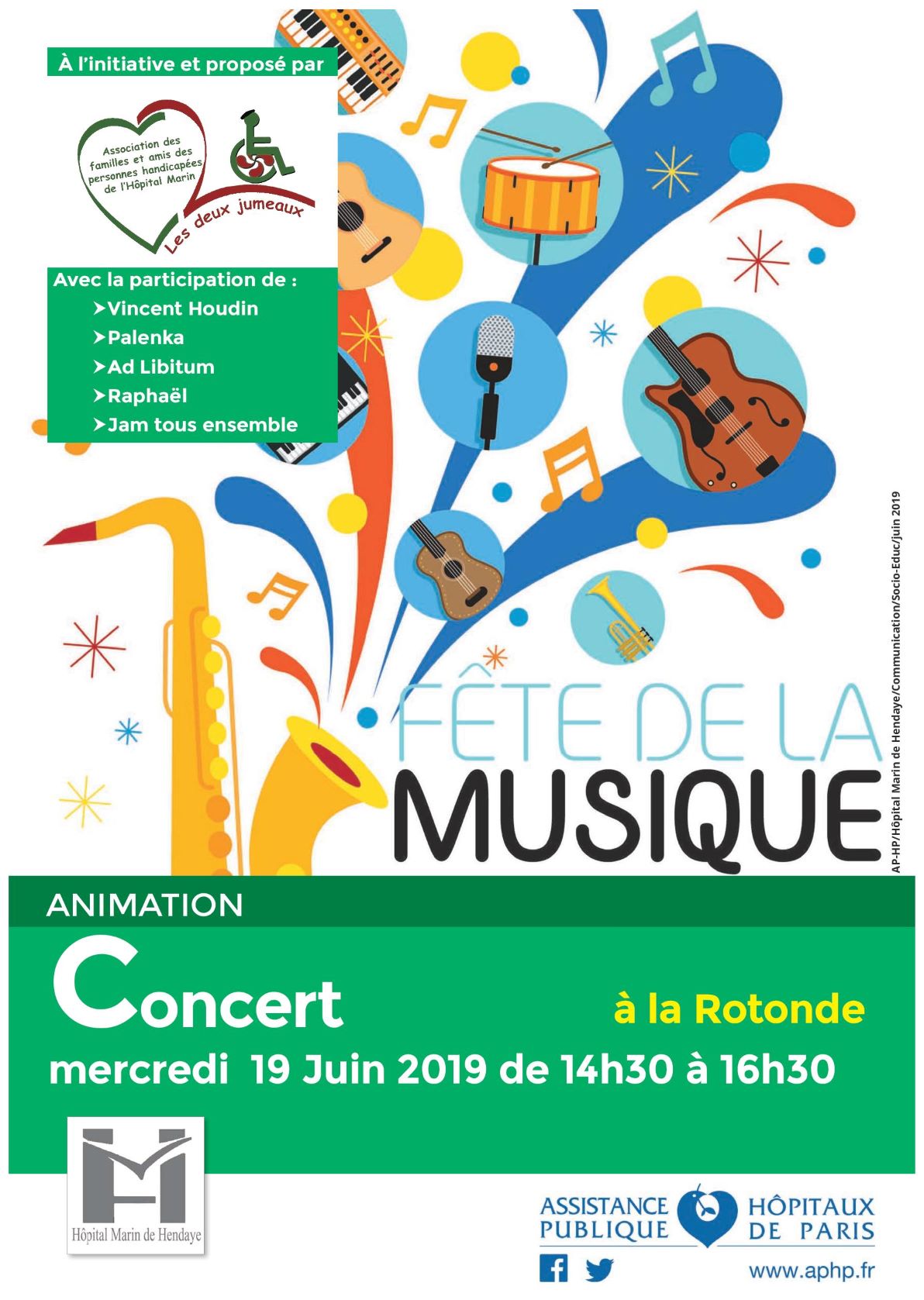 FÊTE DE LA MUSIQUE à L’HÔPITAL MERCREDI 19 JUIN 2019 Publié le 18/06/201918/06/2019 par Deux Jumeaux 96 Familles nous vous attendons nombreux! Vos enfants pour certains seront les vedettes en jouant des percussions ou de l’orgue sensoriel. Le soleil est annoncé! Partagez! Partager sur Facebook(ouvre dans une nouvelle fenêtre) Facebook