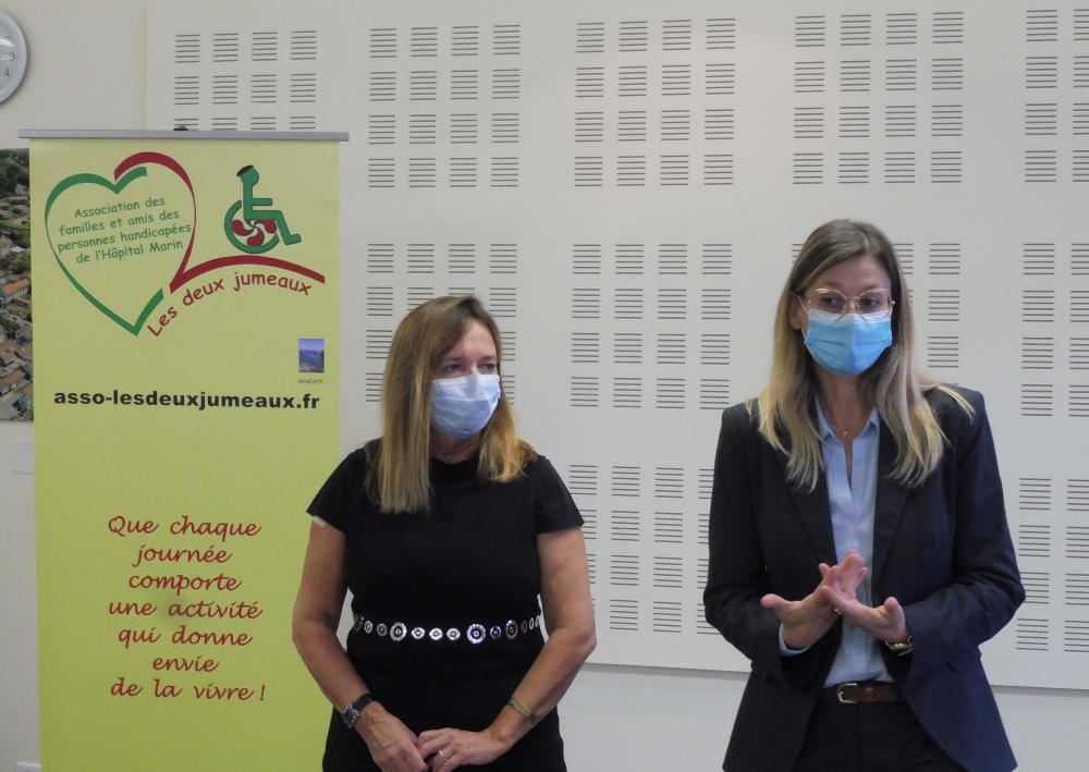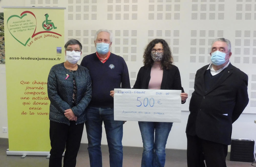 Le 20 octobre 2020, c’est à l’Hôpital Marin de Hendaye en présence de Mme BART, sa nouvelle directrice, Mme SOUDRIE, médecin chef, qu’un chèque de 500 € a été remis par M. MOREAU, Président de l’association des Kiwanis de Ciboure Pays Basque, à l’association Les Deux Jumeaux représentée par ses divers adhérents dont M. ROYE qui s’est exprimé au nom de la présidente retenue à Paris.
