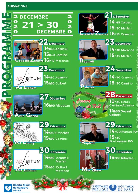 Cette année nous avons pu, avec le service socio-éducatif de l’hôpital, organiser beaucoup d’animations autour de Noël et du 31 décembre. Nos musiciens ont répondu présents, et nos adhérents et donateurs nous ont envoyé un énorme coup de pouce ! Grâce à vous les services de l’Hôpital Marin résonneront plus que d’habitude encore des chants traditionnels et des musiques qui ont bercé nos Noëls de toujours.